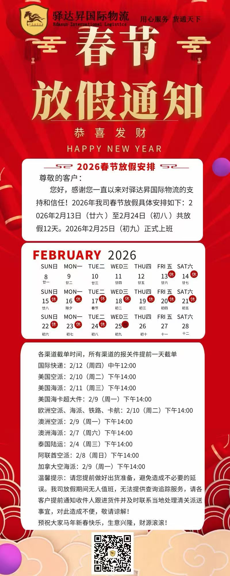 驿达昇 2026年春节放假安排